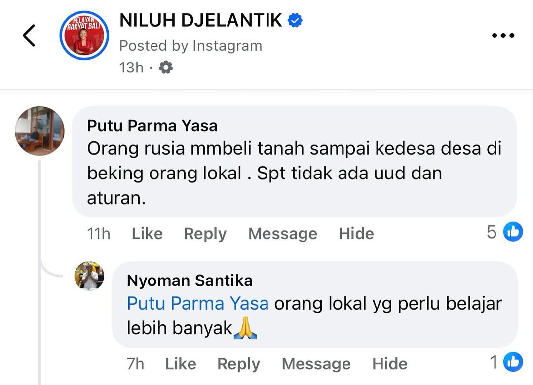 Pawisikbali.com – Denpasar, Ni Luh Djelantik yang kini menjabat Senator RI dari Bali menegur orang-orang yang menjadi backing WNA di Bali melalui akun Instagramnya. Berikut adalah unggahan di akun Ni Luh Djelantik.